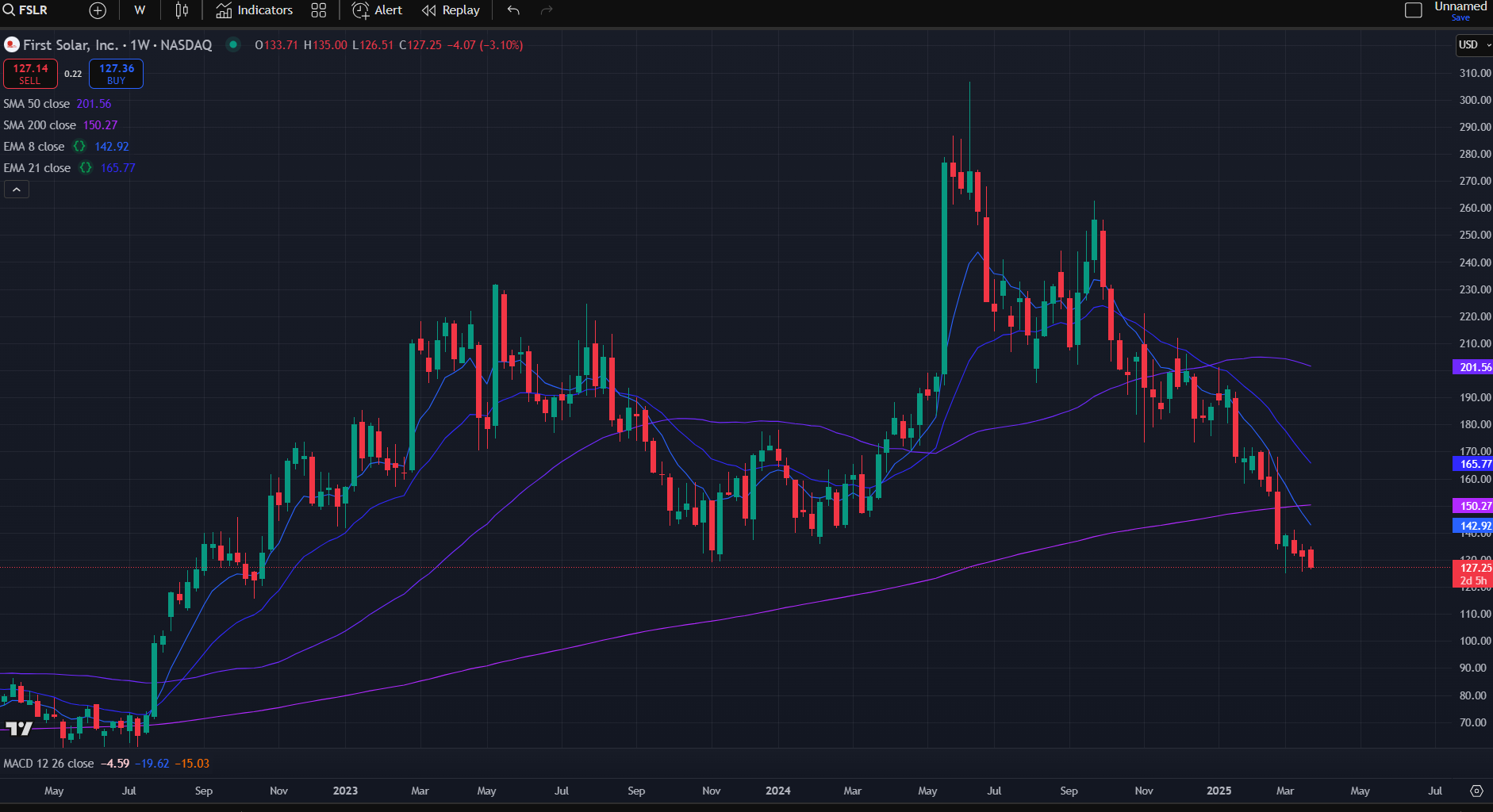 Below is the FSLR weekly chart. It looks like absolute death, fully entrenched in value trap territory. Its forward PE is now 7, trading slightly higher than coal producers.