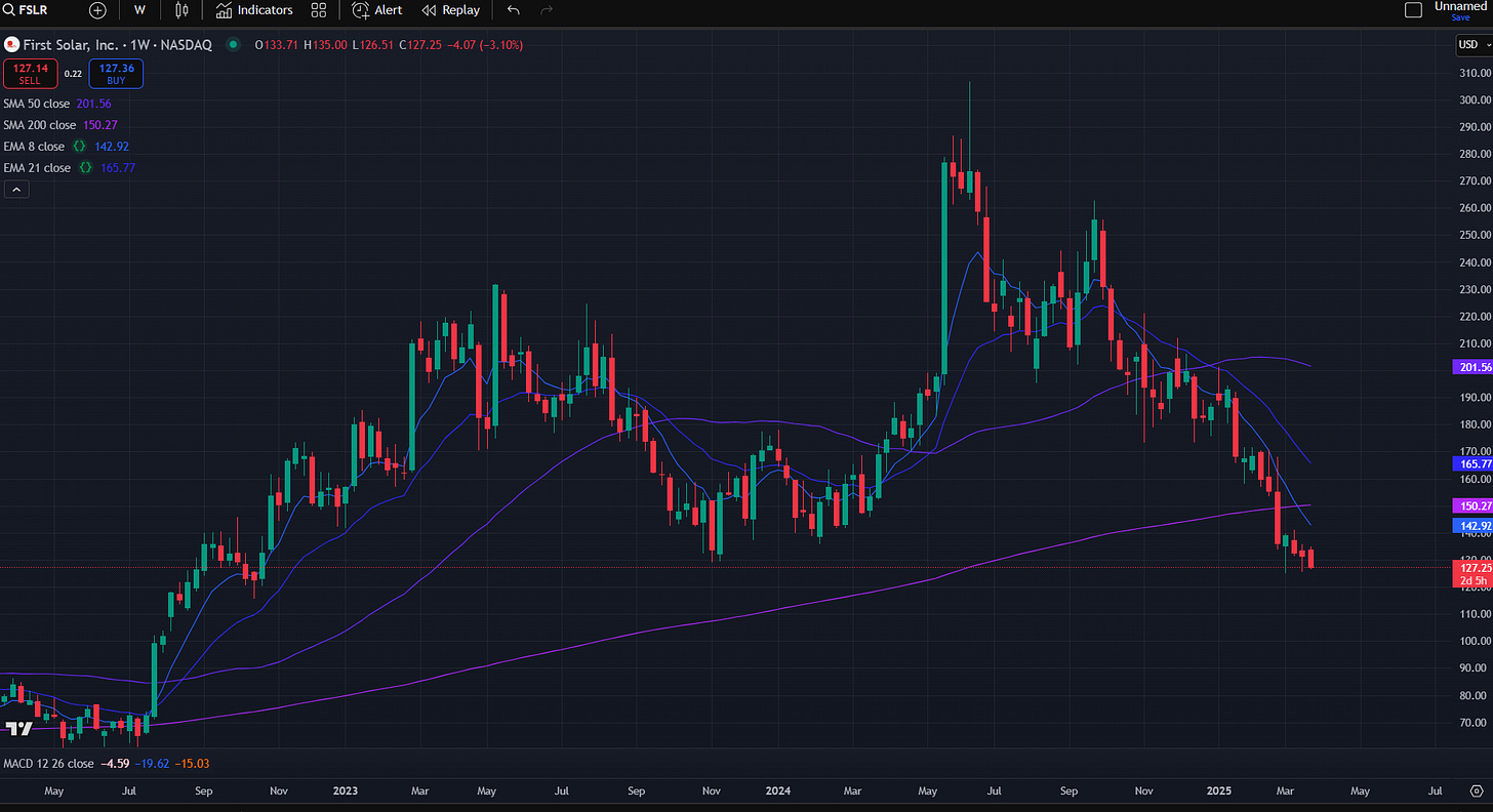For those unfamiliar, FSLR is the world’s largest thin film photovoltaic (“PV”) solar technology company. The company is headquartered in the US and has multiple manufacturing facilities throughout the country. The balance sheet is relatively clean, with this year’s capex fully funded and requiring no new debt based on their latest earnings. Beyond that, there is nothing but fear, uncertainty and doubt.