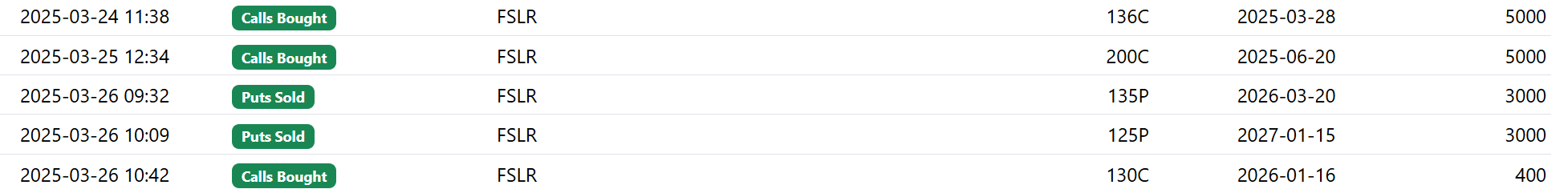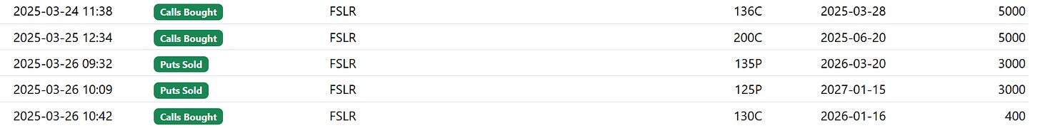 I tend to be in the camp that FSLR is in “if not here, when” territory and that the option flow is pretty suspicious. President Trump has a true believer in the industry chirping in his ear and may just do what Elon recommends. I took the following structured trade today in small size: